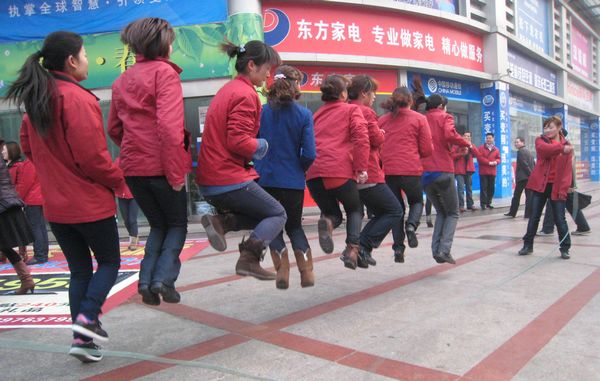 几番的试跳训练后,我们终于上齐了八个人,不出差错的跳着,掌握节奏的跳着,嘴里数着数,大家的努力还是有了成效,在一个节奏上,我们完成了今早连续19跳的好成绩,虽说不是正式比赛,但我们把每一场练习都当做真正的比赛来对待,门前是赛场,男同胞们是裁判,我们是赛者,一场漂亮的比赛在此演绎。