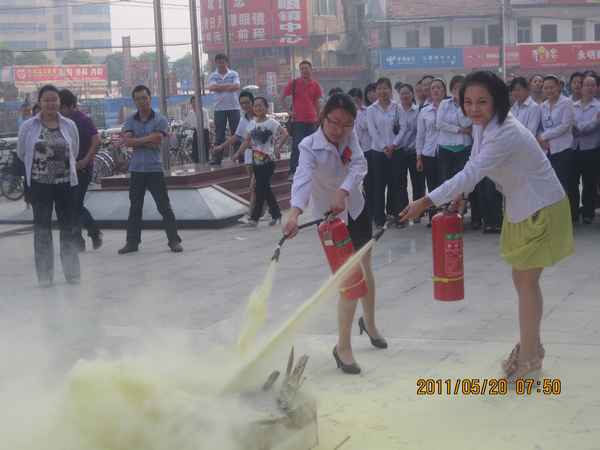 为了进一步检验培训成果, 2011年5月20日上午7:30在沙洋购物广场门前,举办了使用干粉灭火器的消防安全大演练。首先,由安全员在准备好的木块堆上淋上柴油,熊熊大火霎间燃起,只见硝烟滚滚,在一边准备的队员们两人一组,迅速拿起灭火器,去掉保险插销,按照日常培训知识,站在火焰口上风处,将喷嘴对准火焰根部进行喷扫。大火在短时间得到控制,被扑灭。接下来,各部门的队员们都接二连三的参与了实地灭火的演练。队员们都基本掌握了干粉灭火器的使用方法,围观的员工也清楚地了解了灭火的步骤和要领。