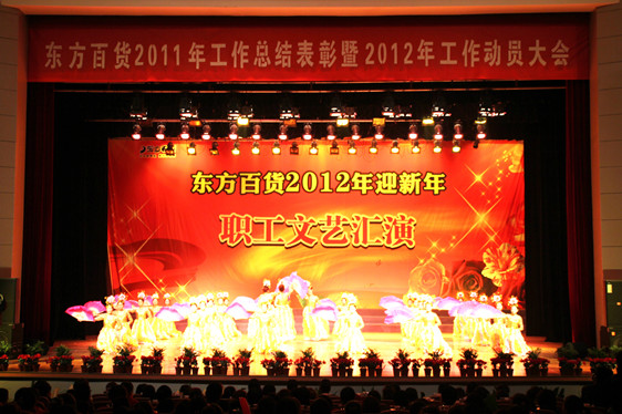 总结表彰大会后,各级领导与广大干部员工一起观看了东方百货2012年迎新年职工文艺汇演。公司总部、钟祥购物广场、京山购物广场、沙洋购物广场、掇刀购物广场的员工纷纷带来舞蹈、小品、情景剧、独唱等节目,表达对公司的良好祝愿及对新年的美好期盼,精彩的表演赢得了现场一千二百余名观众的阵阵掌声。