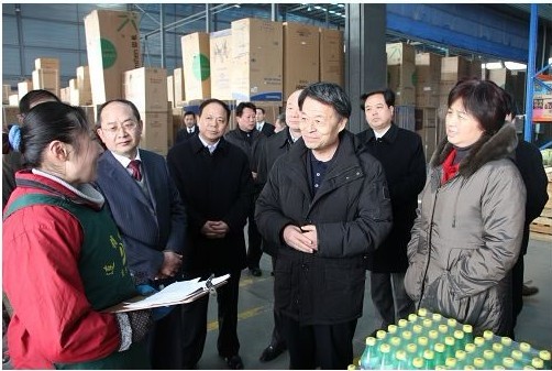 东方百货总经理张兴平(左一)陪同中共中央委员杨传堂(左二)、市委书记王玲(左三)、市长万勇(右二)视察东方百货配送中心
