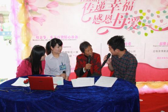 在公司内部同样也洋溢着节日的温馨,母亲节当天在东方百货温馨上演“东方好儿女—歌颂母爱”节目,四名东方好儿女和他们的母亲一道亲临活动现场,与我们共同分享“传递幸福,感恩母爱”的感想,其中针纺商场李路平七年如一日,以博大的母爱和顽强的毅力,呵护儿子的生命,照顾年迈多病的公公,辛勤地付出,作为母亲,她做得相当成功,她带给我们一种家庭亲情的别样感动。日化商场艾桂芹她坚强、乐观、刚毅的性格,让家人感动,让同事拥戴,一直以双倍的爱付出,希望得到女儿理解的她,在这个母亲节提前收到女儿的祝福,她显得格外开心,她向我们诠释了母亲的伟大含义。同时在活动现场东方好儿女和母亲互表心意,言不尽的感恩,道不完的感动,他们为我们演绎了一个温馨感人的母亲节。