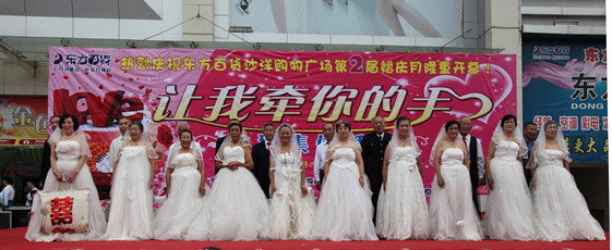 9月22日下午4点,东方百货沙洋购物广场迎来了一场非同寻常的婚礼。10对新婚夫妇以及10对金婚夫妇在东方百货门前广场举行了温馨而浪漫的集体婚礼,纪念爱情的神圣与伟大。