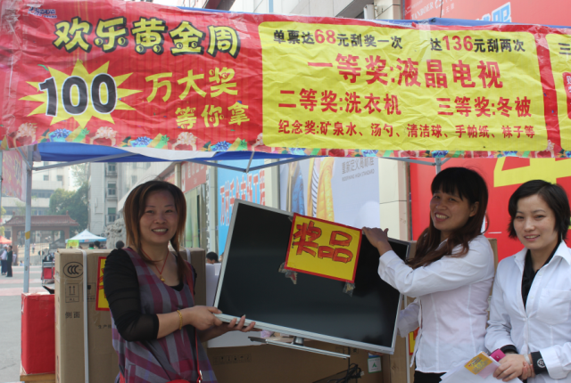 与此同时,东方百货中天街店、苏畈桥购物广场、掇刀购物广场等都相继送出液晶彩电、洗衣机等大奖,活动将持续至10月7日,敬请广大市民前来参与购物刮大奖!