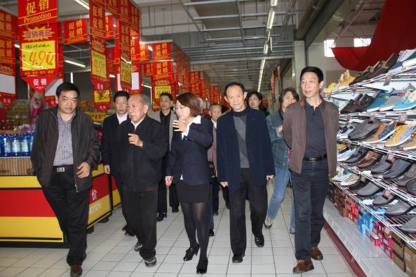市社党委委员、总会计师程丽琴(右三)市社党委委员、纪委书记王锋(左二)等领导陪同老干部参观市东方百货掇刀购物广场