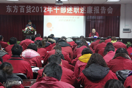 为贯彻落实年度考核工作的部署,进一步加强干部队伍建设,切实提高领导干部履行岗位职责的能力和水平,按照党风廉政建设责任制规定和公司干部管理的要求,2013年1月7日-8日,东方百货召开了2012年干部述职述廉报告会,总经理张兴平主持会议。