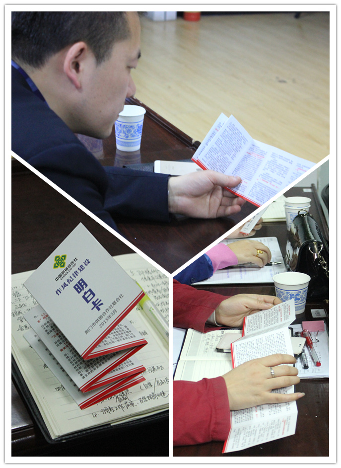 会上,全体党员干部还集中学习了由荆门市供销合作社联合社集中印发的《作风纪律建设明白卡》,其中包括《党章》规定的“四个服从”、中央关于改进工作作风、密切联系群众的八项规定、中央六项禁令、习近平总书记强调严守政治纪律和政治规矩的“五个必须、五个决不允许”、党风廉政建设的“两个责任”、“一岗双责”、“一案双查”、省委组织部的“四个凡是、四个一律”、市委强调遵守政治纪律和政治规矩的“十个严禁”等十四大项学习内容。张兴平强调,每一位党员干部都要认真学习“明白卡”,自我检查,深刻反思,自觉加强行业作风建设,坚决遏制不正之风,要做守政治纪律和政治规矩的清醒人、明白人;要牢固树立法制观念、法治意识和法治思维,自觉在实践中落实践行,主动适应全面依法治国新常态。