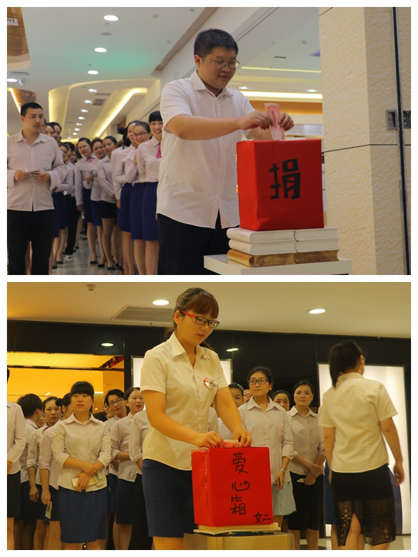 7月28日早上,公司百货、家电、超市、机关科室各自分块组织赈灾募捐活动,广大领导干部们积极发挥带头作用,员工们也都踊跃奉献自己的爱心,希望能为那些受灾的父老乡亲送去温暖和希望,缓解他们的燃眉之急,帮助他们重塑生活的信心、重建美好的家园。