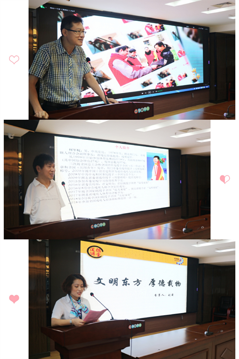 为进一步提升干部职工的道德素养,构建崇德尚善的工作环境,7月19日,东方百货在来凤大厦11楼组织开展“弘扬雷锋精神,建设文明荆门”道德讲堂活动。本次活动特邀荆门市义工联秘书长、荆门市志愿者联合会会长严昌筠先生,残奥冠军、五好家庭何军权先生进行道德模范宣讲,公司全体党员干部参加此次活动。