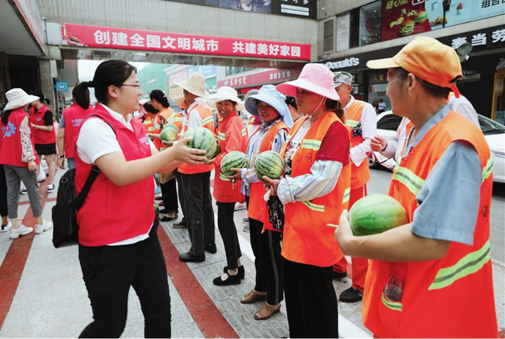 (两图为七月志愿队为市民、环卫工人送清凉)
