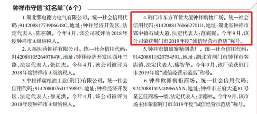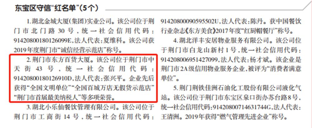 近日,市社会信用体系建设领导小组办公室、市发展和改革委员会、人行荆门市中心支行主持召开全市第三季度信用“红黑名单”和联合奖惩案例各县市区专场发布会。荆门市东方百货大厦、荆门市东方百货大厦麻城店、荆门市东方百货大厦钟祥购物广场,荣登守信“红名单”,溢彩流光。