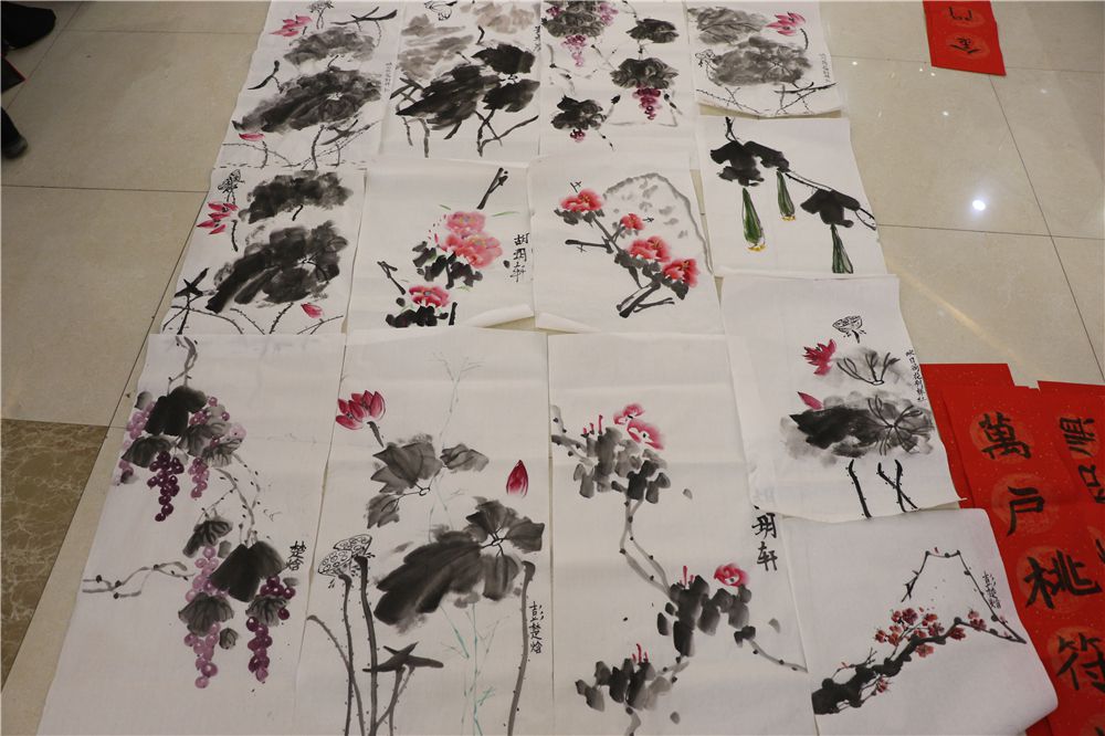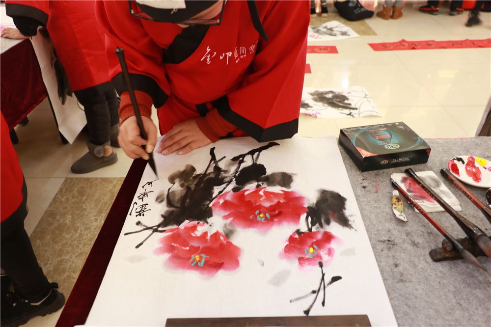 现场除了写春联,更有国画展示。只见他们笔锋微动,栩栩如生的水墨花卉便跃然纸上。