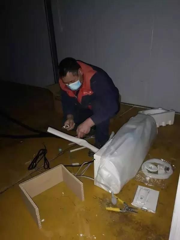 此次援助,时间紧,任务重,且面临医院尚未通电、夜晚施工等不利环境。东方家电售后员工在空荡的板房内,举着昏黄的手电爬梯登高,摸索着摆放外机,连接管线,吊装室内机……历经三个小时,空调全部安装完毕,并成功运行。