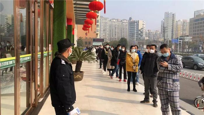 在超市入口处,市民保持安全距离有序排队等候,体温测量合格后方可分批进入卖场购物。