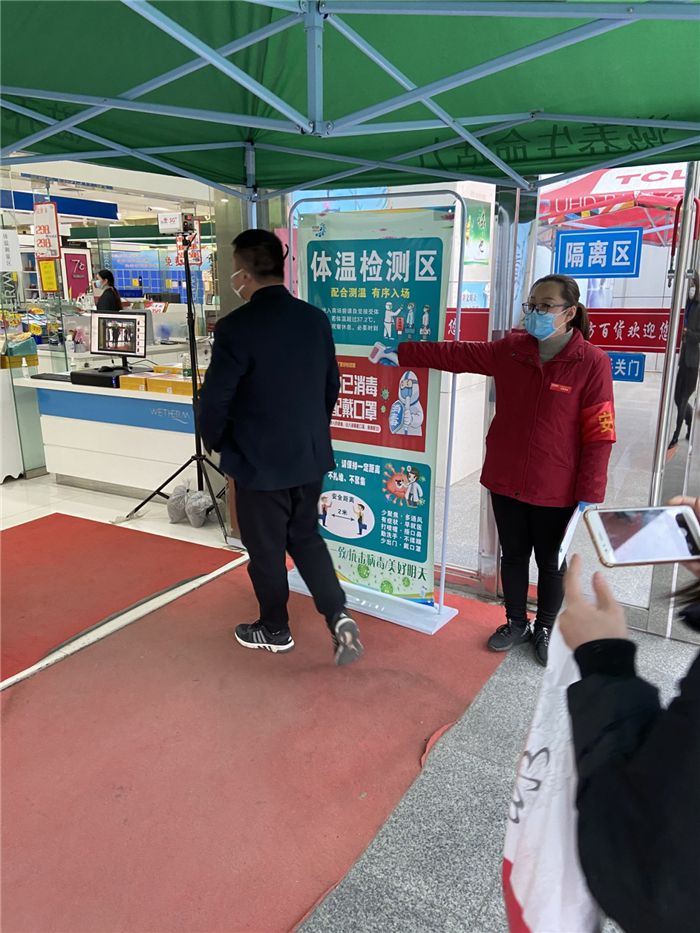 商场门前工作人员引导进店人员进行扫码通行,进店