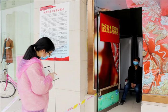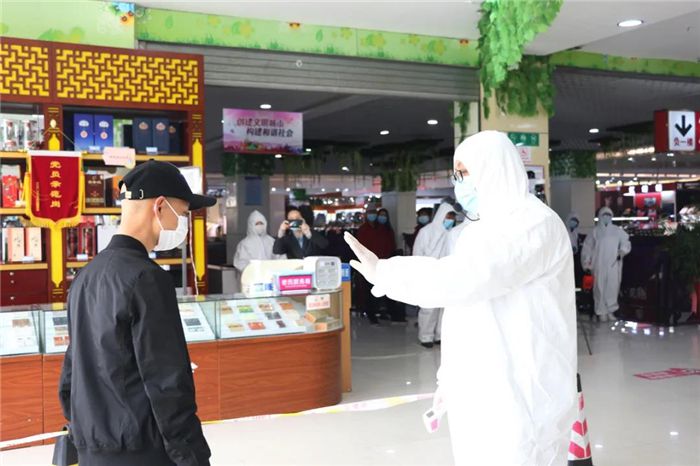 卖场入口体温测量处,通过热成像体温测量仪发现一名顾客体温异常,保安人员迅速引导该顾客到应急隔离区,并第一时间向门店负责人报告。从发现疑似、启动疫情防控应急处置预案、封锁现场疏散人员、区域全方位消毒等连贯行动的同时,迅速向社区和东方百货集团疫情防控工作领导小组进行汇报,协调120进行安全转移……演练整个环节紧密对接,严谨规范,应急小组人员配合默契,闻令而动,演练现场秩序井然,顺利完成模拟演练。