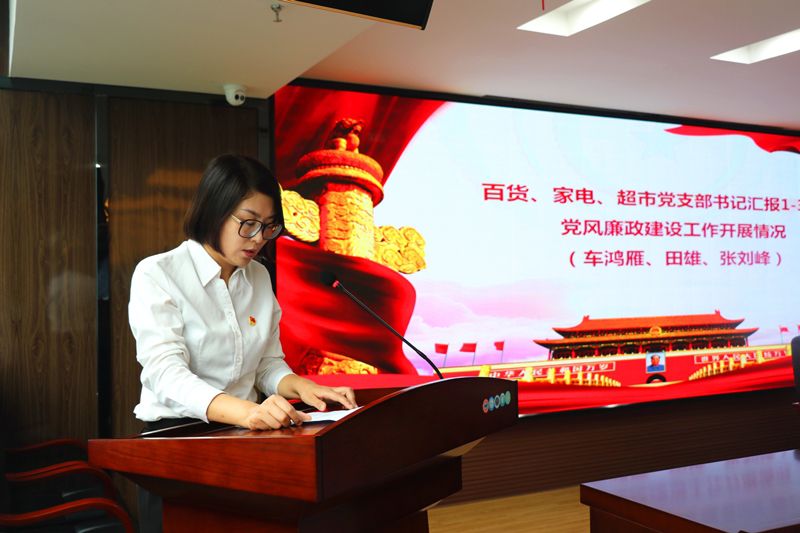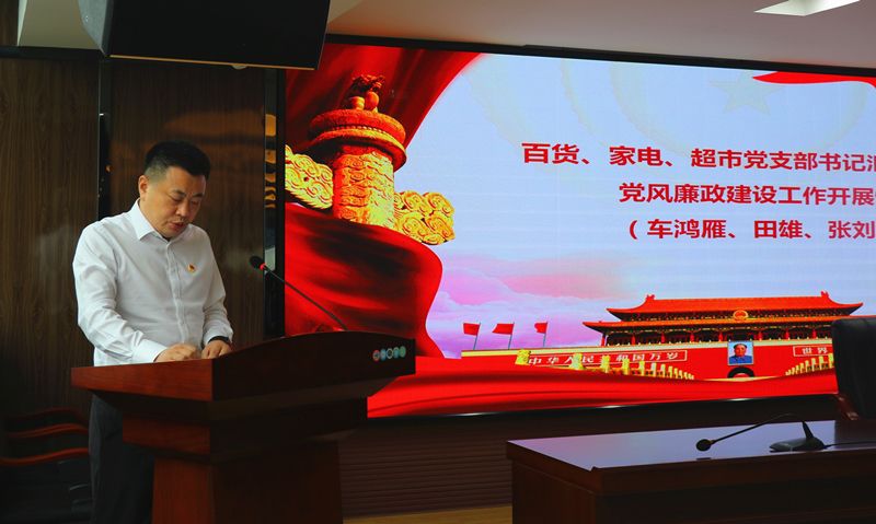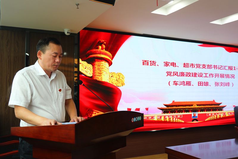 百货、家电、超市党支部书记车鸿雁、田雄和张刘峰分别汇报1-3季度党风廉政建设工作开展情况,表示要稳步推进党支部廉政教育工作,加强各支部党员干部的廉洁从业意识,营造风清气正的干事氛围。