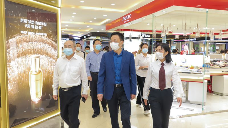 在百货大厦,王书记与楼层经理亲切交谈,了解复工复产后品牌经营情况、换季货品储备、销售业绩等,并嘱咐大家要坚定信心,保重身体,在做好经营工作的同时,更要常抓不懈做好安全防疫。