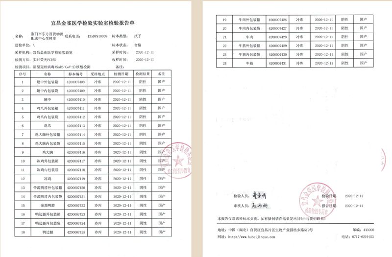 在东方百货物流配送中心生鲜库,核酸检测人员认真查验了冷链食品进货来源、标签标识、库存量等信息,仔细核对了冷链食品录入一码一品情况及销售流通情况,确保实现冷链食品全过程全链条可追溯,做到所有冷链食品来源可查、去向可追。还对冷链食品货架、外包装箱、内包装袋以及肉类表面等进行采样,并做专业检测,共采集样本24例,检测结果均为阴性。