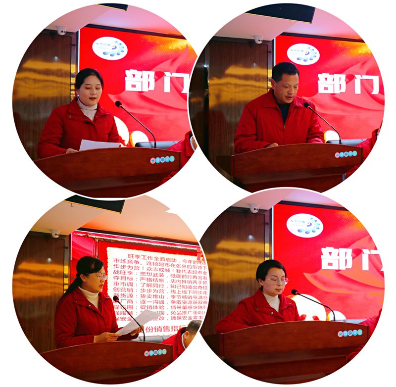 会上,公司部门代表纷纷就元旦及旺季工作表决心,为备战元旦以及旺季的销售工作作出郑重承诺,百货、家电、超市以及机关科室代表就如何做好旺季工作表态发言,承诺以更加饱满的热情,更加扎实的作风,更加昂扬的斗志迎接旺季战役的考验,锁定目标,坚定信心,全力以赴,以优异的成绩向公司交出一份满意的答卷。
