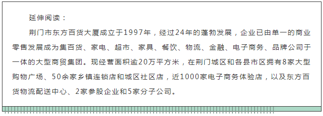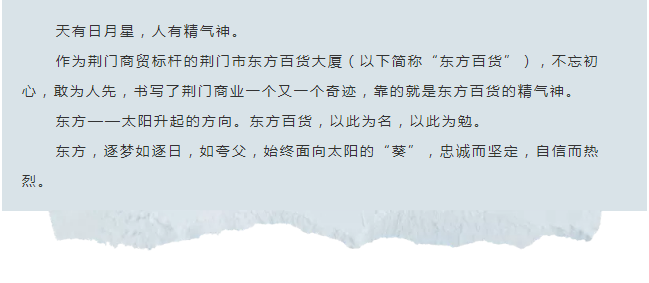 伴随着改革开放的春风,东方百货在繁华的中天街扎根立足。24载路漫漫,在公司领导班子的带领下,东方百货5000余名员工戮力同心、砥砺前行,在竞争激烈的环境中,创造了一系列骄人业绩,打响了东方品牌,彰显了大型国有企业的控制力、带动力、影响力和生命力,在荆门商贸流通业的发展史上写下了浓墨重彩的一笔。