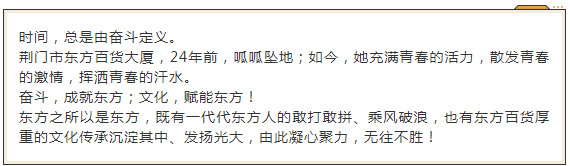 他们是东方百货企业文化的外在表现,是企业精神的传承。独树一帜的东方文化品牌更是荆楚大地上一道靓丽的风景线,也是一代代东方人薪火相传的精神力量。