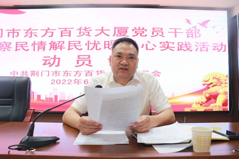 会议最后,东方百货党委书记、总经理张兴平同志宣读荆门市东方百货大厦党员干部下基层察民情解民忧暖民心实践活动方案,并做动员讲话。他强调,各部门要按照中央、省委、市委的统一部署,走好新时代党的群众路线,深入基层一线,面对面、心贴心、实打实,用心用情用力用爱去服务群众,切实推动下基层察民情解民忧暖民心实践活动走深走实。