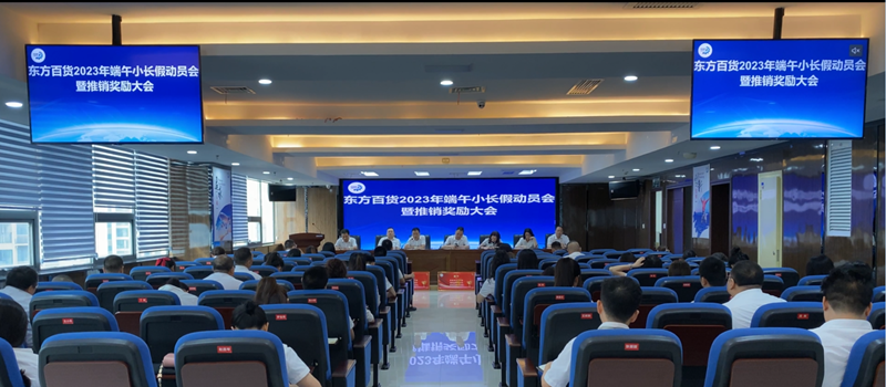 为进一步统一思想、明确目标、鼓舞士气、增强信心,打好端午小长假销售攻坚战,打赢半年工作持久战,6月21日,东方百货组织召开2023年端午小长假动员会暨推销奖励大会,会议由东方百货副总经理田雄主持,参会人员包括公司副职及以上干部、县市区、分公司主要负责人等百余人参会。