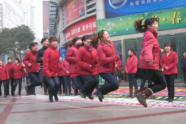 几番的试跳训练后,我们终于上齐了八个人,不出差错的跳着,掌握节奏的跳着,嘴里数着数,大家的努力还是有了成效,在一个节奏上,我们完成了今早连续19跳的好成绩,虽说不是正式比赛,但我们把每一场练习都当做真正的比赛来对待,门前是赛场,男同胞们是裁判,我们是赛者,一场漂亮的比赛在此演绎。