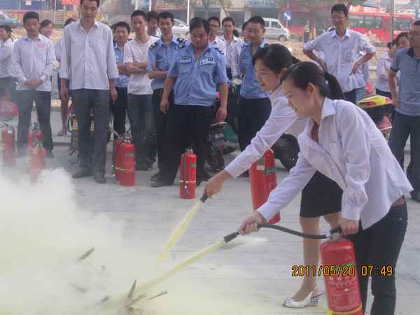 为了进一步检验培训成果, 2011年5月20日上午7:30在沙洋购物广场门前,举办了使用干粉灭火器的消防安全大演练。首先,由安全员在准备好的木块堆上淋上柴油,熊熊大火霎间燃起,只见硝烟滚滚,在一边准备的队员们两人一组,迅速拿起灭火器,去掉保险插销,按照日常培训知识,站在火焰口上风处,将喷嘴对准火焰根部进行喷扫。大火在短时间得到控制,被扑灭。接下来,各部门的队员们都接二连三的参与了实地灭火的演练。队员们都基本掌握了干粉灭火器的使用方法,围观的员工也清楚地了解了灭火的步骤和要领。