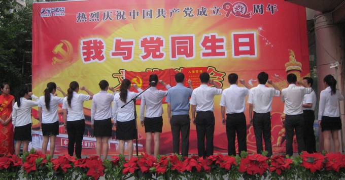 7月1日晚,东方百货庆祝共产党成立90周年“我与党同生日”职工文艺晚会在门前广场举行。鲜红的党旗迎风飘扬,入党的誓言铮铮响。晚会上,8名预备党员光荣转正,12名同志为党组织接纳,成为中国共产党预备党员。姜蕙香同志代表公司党委发表了慷慨激昂的讲话,号召全体干部职工向党组织靠拢,不断强化自身与团队建设,为企业的美好明天奋力拼搏、再创佳绩。