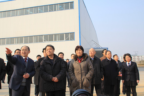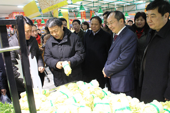 东方百货总经理张兴平(左一)陪同中共中央委员杨传堂(左二)、市委书记王玲(左三)、市长万勇(右二)视察东方百货配送中心