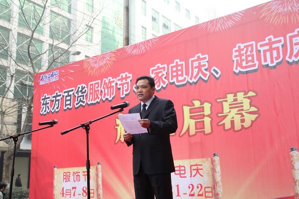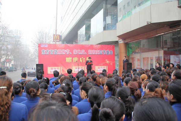 上午8点,东方百货第十五届服饰节、家电庆、超市庆三节来临之际,全体干部职工在门前广场举行了声势浩大的三节启动仪式。