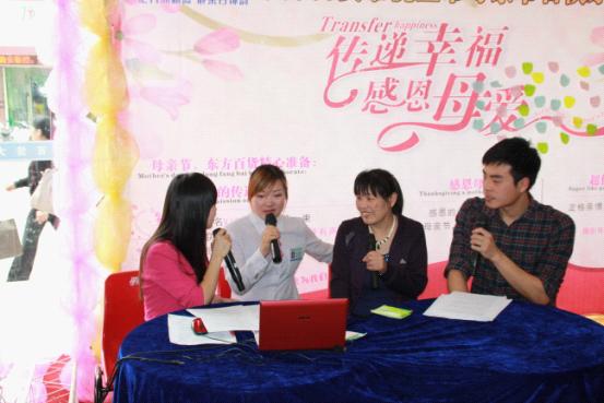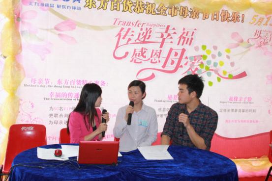 在公司内部同样也洋溢着节日的温馨,母亲节当天在东方百货温馨上演“东方好儿女—歌颂母爱”节目,四名东方好儿女和他们的母亲一道亲临活动现场,与我们共同分享“传递幸福,感恩母爱”的感想,其中针纺商场李路平七年如一日,以博大的母爱和顽强的毅力,呵护儿子的生命,照顾年迈多病的公公,辛勤地付出,作为母亲,她做得相当成功,她带给我们一种家庭亲情的别样感动。日化商场艾桂芹她坚强、乐观、刚毅的性格,让家人感动,让同事拥戴,一直以双倍的爱付出,希望得到女儿理解的她,在这个母亲节提前收到女儿的祝福,她显得格外开心,她向我们诠释了母亲的伟大含义。同时在活动现场东方好儿女和母亲互表心意,言不尽的感恩,道不完的感动,他们为我们演绎了一个温馨感人的母亲节。