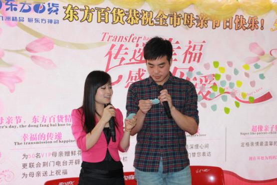 5月13日是每个伟大母亲的节日,在这个温馨的节日里,东方百货特推出“传递幸福 感恩母爱”系列活动,其中联合荆门电台开辟“母爱有声”专栏,让儿女们高调表达了对母亲的爱,同时精心挑选50名VIP顾客,以一束鲜花送上家门,将幸福传递至母亲的心中,更有“超像亲子照',定格住子女与母亲之间的亲情最温馨的时刻。东方百货用特别的感恩、特别的爱献给了广大母亲。