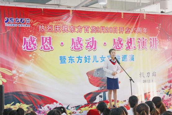 9月18日,东方百货大厦举办的“感动 感恩 感想”演讲暨东方好儿女宣讲活动伴随着清晨凉爽清新的缕缕微风在掇刀购物广场拉开了帷幕。公司对此次活动一直给予密切的关注与支持,公司副总经理邹诗娥等领导带着公司的支持与期盼前往掇刀购物广场助阵。历时两个多月的层层筛选,有7位优秀的选手脱颖而出。他们有来自一线的员工,也有来自科室的科员,相同的是他们都是值得我们骄傲的东方人,他们用坚定的语言和自信的微笑向我们深情述说着对东方的感恩情怀。