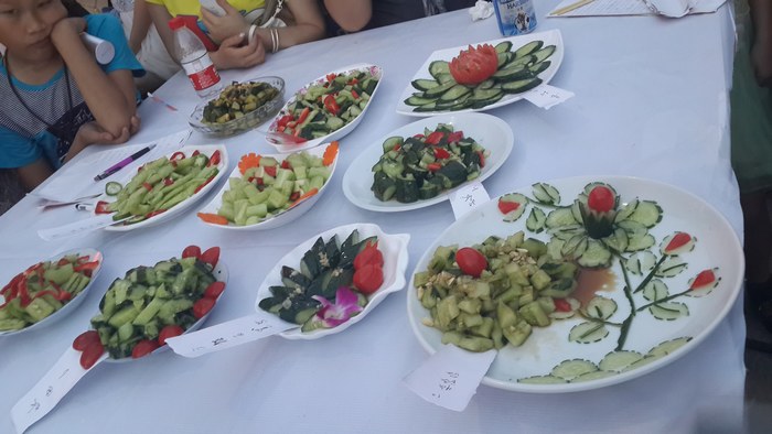 30分钟后,厨神们的作品相继出锅,凉拌黄瓜在选手们的精雕细琢下,呈现近十种做法,切片、滚到、刀拍,配以红椒、胡萝卜等辅料,精致的装盘,让观众大开眼界;啤酒鸭的做法风格各异,尤其是装盘更令人啧啧称叹,日化工艺、收银台、后勤科室队的装盘颇具创意,让人眼前一亮。