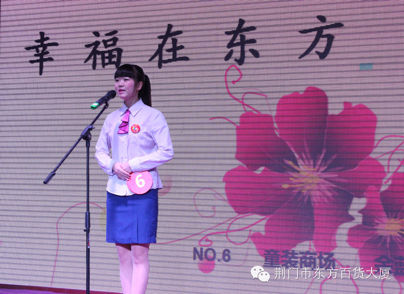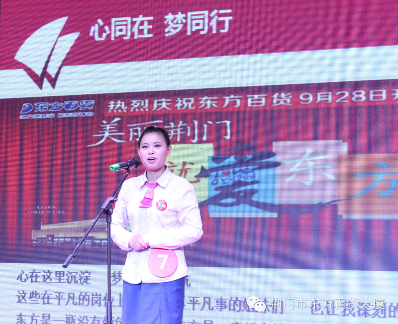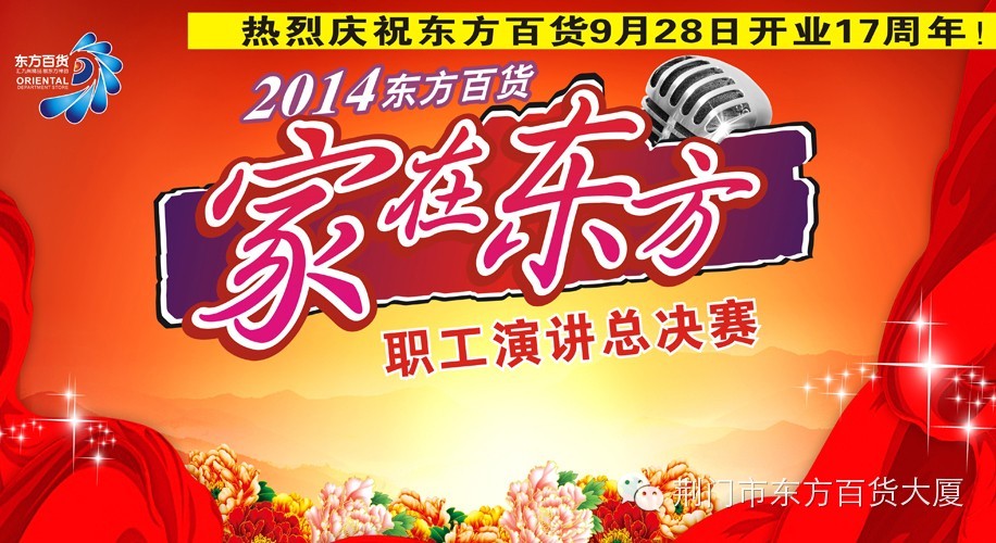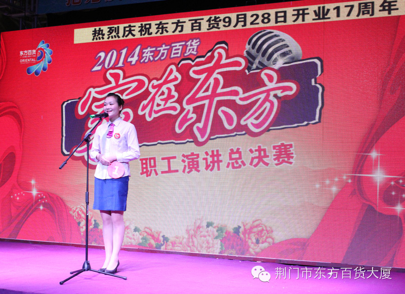 热烈庆祝东方百货9月28日开业17周年!今晨在东方百货二楼中厅举行了“家在东方”职工演讲总决赛。参与到此次比赛中的有10名参赛选手、强大的评委阵容以及职工方阵。这10名选手在激烈竞争中脱颖而出,得以在决赛中展示他们的个人风采。她们以饱满的热情,用自己亲身经历的故事讲述了在东方事业中的各种精彩体验,展示了东方人的独特魅力。