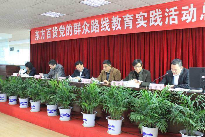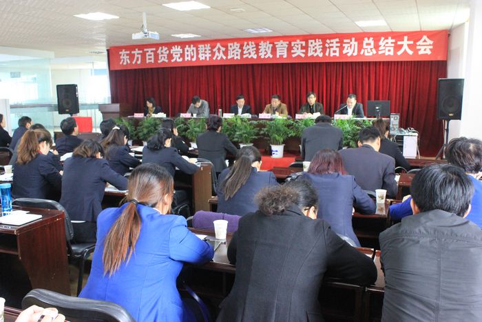 2014年10月31日上午,东方百货大厦党的群众路线总结大会在电教室准时召开。市委第十五督导组组长阮德雄同志,副组长刘星同志,成员张全同志以及市供销社主任、党委副书记却运新同志,市供销社纪委书记、党委委员郑俊山同志亲临参加总结大会,东方百货副总经理金柱平同志作总结报告。会议由东方百货工会主席、分管经理邹诗娥同志主持,东方百货大厦党委班子成员及全体党员干部悉数参加了会议,并对东方百货领导班子教育实践活动开展情况进行了民主评议。