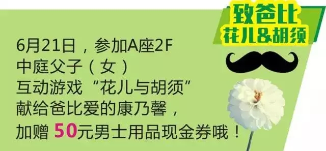 6月21日带着你的爸比,到东方百货A座二楼中厅,与我们一起嗨!爸爸的胡须实为“花儿”所做,将其拔出送给亲爱的爸比,满满的温馨满满的爱!参与活动时拍照分享还可获得50元男士用品现金券哦!
