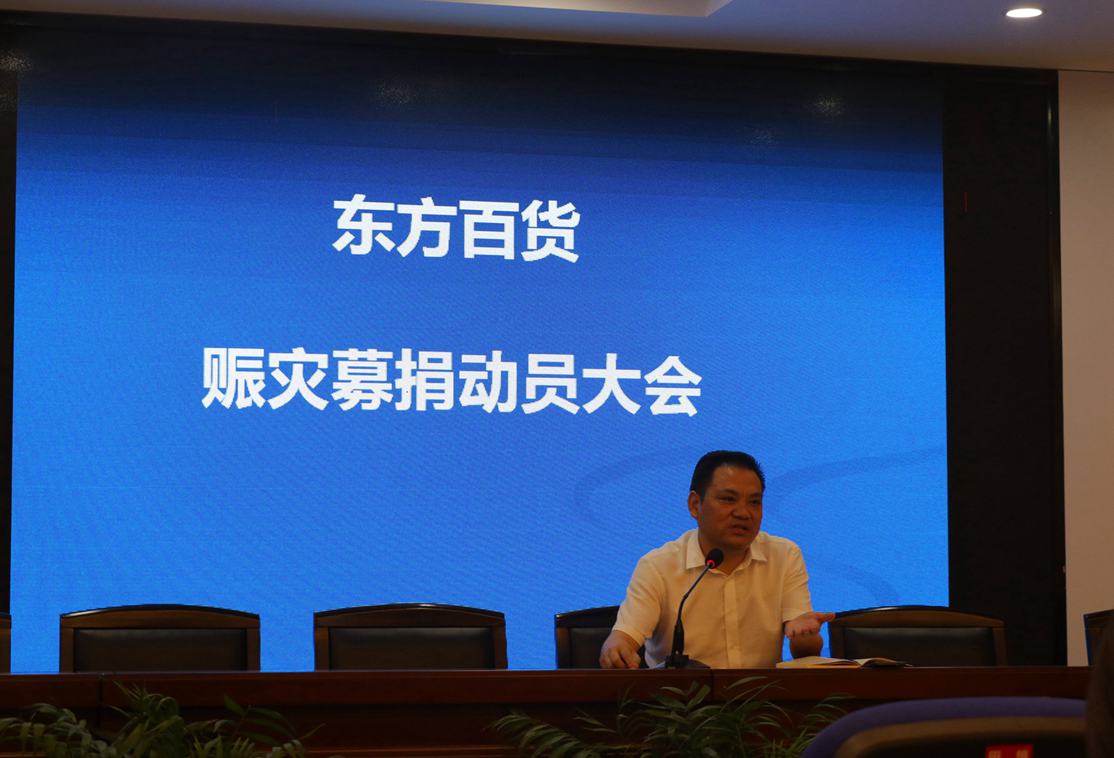 洪水无情,人间有爱!7月27日下午,东方百货大厦组织全体副职以上中高层干部召开爱心动员会,公司行政执总金柱平同志在会上强调,东方百货将全力支持洪涝灾区抗汛救灾工作,坚持把救助落到实处,各部门要积极组织赈灾募捐活动,各党员干部要充分发挥先锋带头作用,切实把“两学一做”的精神落实到救灾活动中,确保把爱心传递到灾区群众手中。