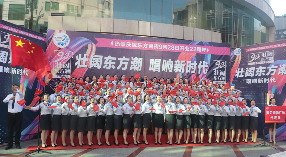 自八月份以来,东方百货组织开展一系列活动喜迎新中国成立70周年,讴歌祖国的伟大历程和辉煌成就。8月7日—30日,东方百货“壮阔东方潮 唱响新时代”合唱大赛精彩演绎,全员以饱满的精神状态,深情嘹亮的歌声唱出了热爱党、热爱祖国、热爱东方的炽热情怀。