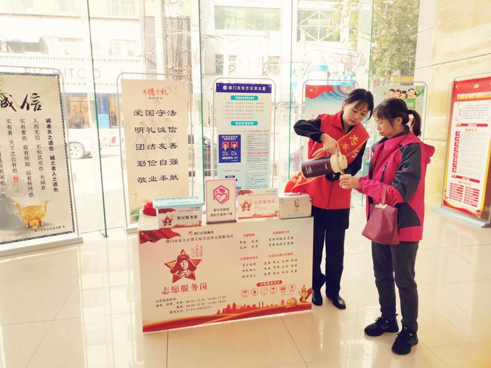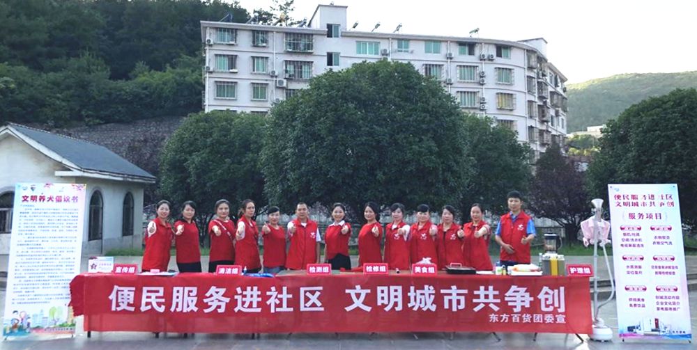 投身公益,爱心助力。为弘扬“奉献、友爱、互助、进步”的志愿精神,传播志愿服务理念,东方百货成立了关爱志愿服务队、邻里守望志愿服务队、便民利民志愿服务队及文明劝导志愿队。在社会关爱方面,开展了关注留守儿童、残障儿童、退伍军人(军烈属)及爱心助农公益行动;在环境改善方面,联合社区对背街小巷、无物业小区进行清理,改善脏乱差的环境,消除不文明现象;在便民服务方面,为广大市民提供免费饮用水、爱心伞、爱心轮椅及婴儿车;在文明创建方面,组织志愿者到各交通要道对违反交通安全的行为进行制止和劝导……东方人用实际行动诠释了“创城有我”的责任与担当。