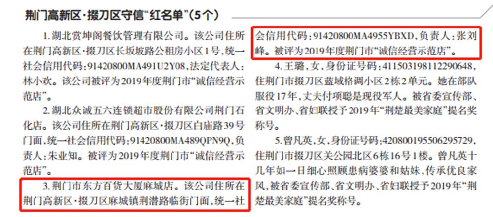 近日,市社会信用体系建设领导小组办公室、市发展和改革委员会、人行荆门市中心支行主持召开全市第三季度信用“红黑名单”和联合奖惩案例各县市区专场发布会。荆门市东方百货大厦、荆门市东方百货大厦麻城店、荆门市东方百货大厦钟祥购物广场,荣登守信“红名单”,溢彩流光。