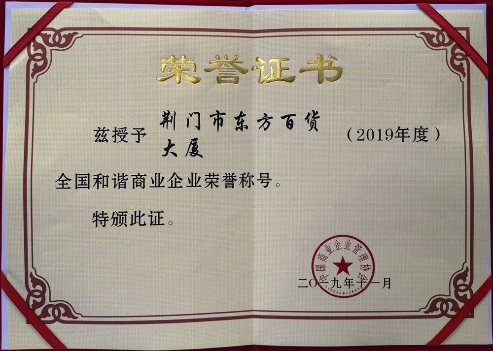 东方百货的快速健康发展,赢得了社会各界的普遍认同,企业年年被评为“消费者最满意单位”,先后荣获“全国文明单位”、“全国青年文明号”、“全国商业质量效益型先进企业”、“全国无障碍购物商场”、“全国绿色商场”、“节能减排示范企业”、荆门市首届“最美纳税人”、荆门市“高质量发展突出贡献企业”、荆门市“高质量发展突出贡献企业家”等荣誉称号。二十二年来,东方百货热心公益,扶贫扶困,累计捐款捐物达数百万元。