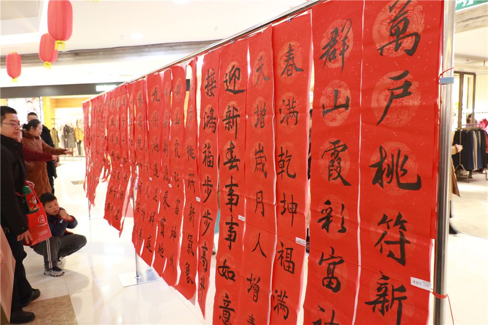 中国书法家、荆门书协副主席张大军出席了活动现场,并亲笔书写了对联和“福”字,免费赠送给现场的消费者朋友们。同时,中国楹联名家涂德海先生也亲临现场为本次活动撰联:东宝舞旗,商海扬帆,奋进新时代。方家泼墨,兰亭联谊,放歌大有年。