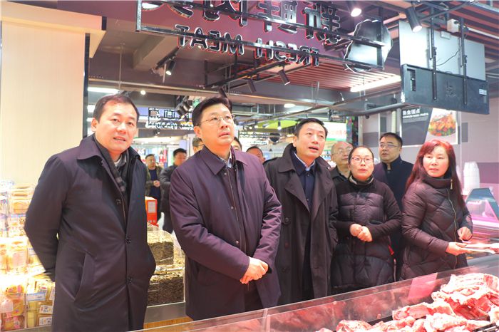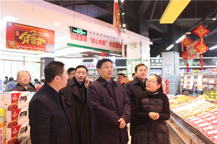 1月17日上午,副市长丁岱到东方百货惠民农贸超市检查稳价保供和安全生产情况,市政府副秘书长王娈、市商务局、市市场监管局等单位主要负责人、市供销社党委书记、主任王卫华、东方百货主要负责人陪同检查。
