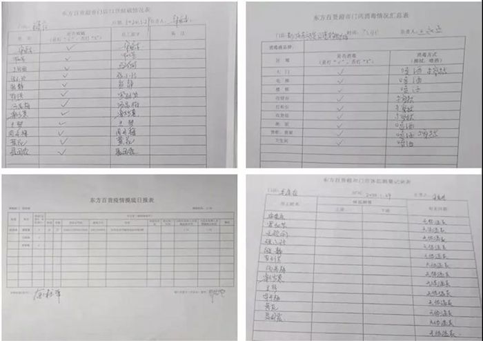 秉着对员工高度负责的态度,东方百货大厦还专门制定了疫情摸底日报表、发热病人动态跟踪表、体温测量日报表等5个跟踪表,对一线员工的体温检测进行严格把关,并安排党员干部深入一线,督办落实各项防疫工作,第一时间了解员工身体健康状态,第一时间排查可能出现的健康隐患,为“防控、保供”工作的顺利开展打好坚实的群众基础。