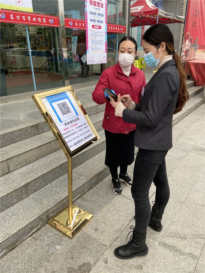 商场门前工作人员引导进店人员进行扫码通行,进店