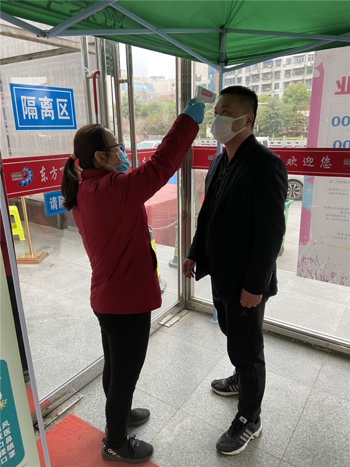 工作人员对发热顾客进行资料登记,请顾客稍做休息再复查体温