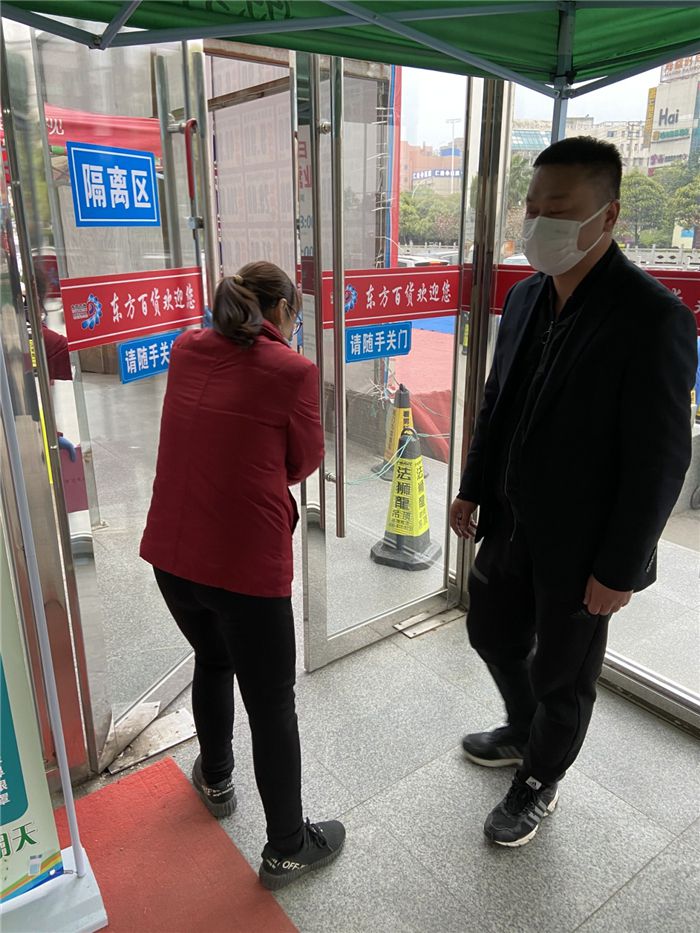“商场营业中,发现顾客体温异常怎么处理?”“商场人流较多,如何及时疏散?”……为确保商场营业时顾客能愉快购物,员工能全心上班,东方百货沙洋购物广场在县商务局领导下,根据《企业复工复产疫情防控工作方案》,为提升商场员工应急处置疫情防控能力,进一步加强疫情防控宣传,于2020年4月1日在商场开展疫情防控应急处置演练,模拟营业中遇发热人员,各环节应急处理。县商务局、县疾控中心现场对应急演练进行观摩,并对此次应演练进行点评。